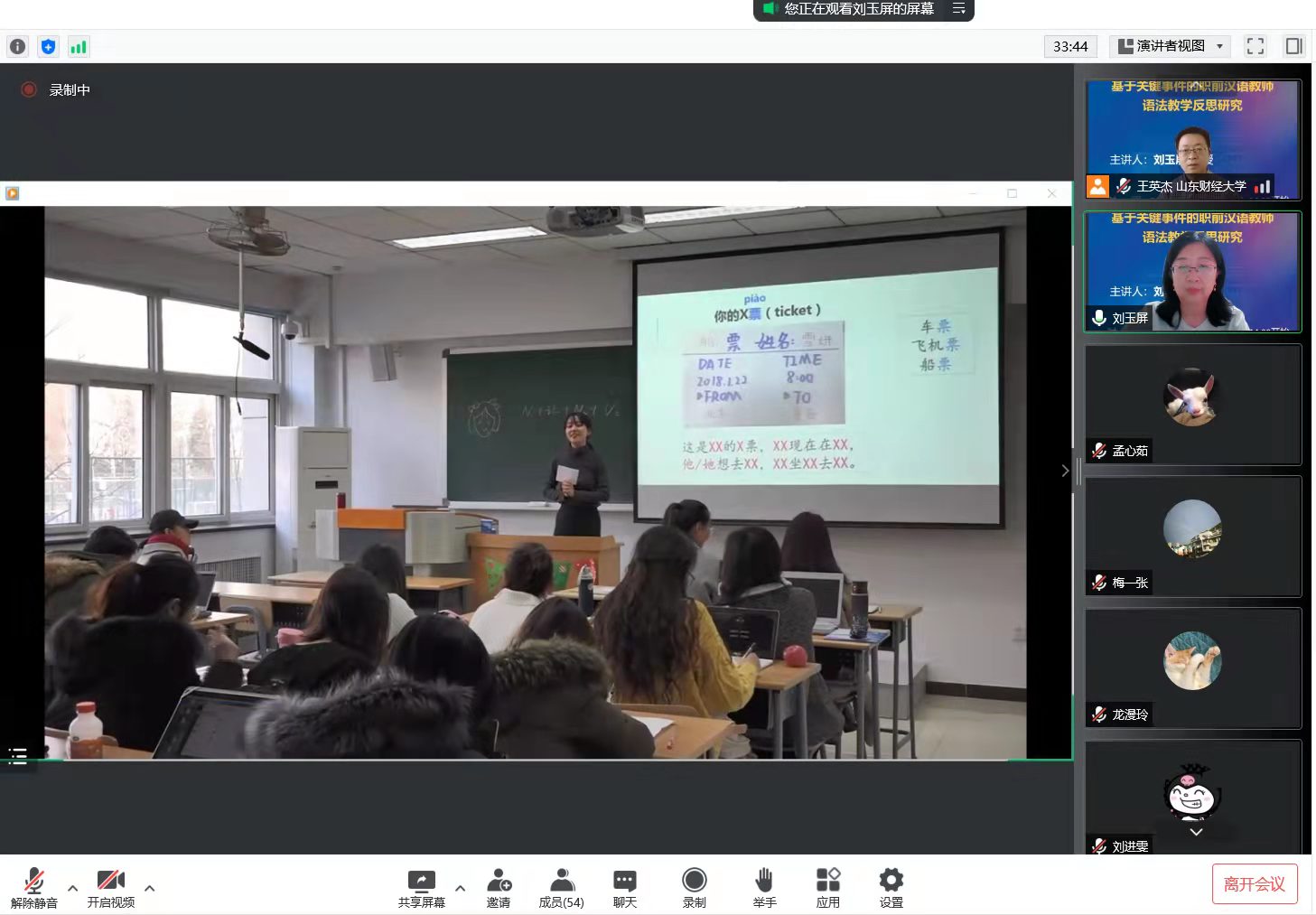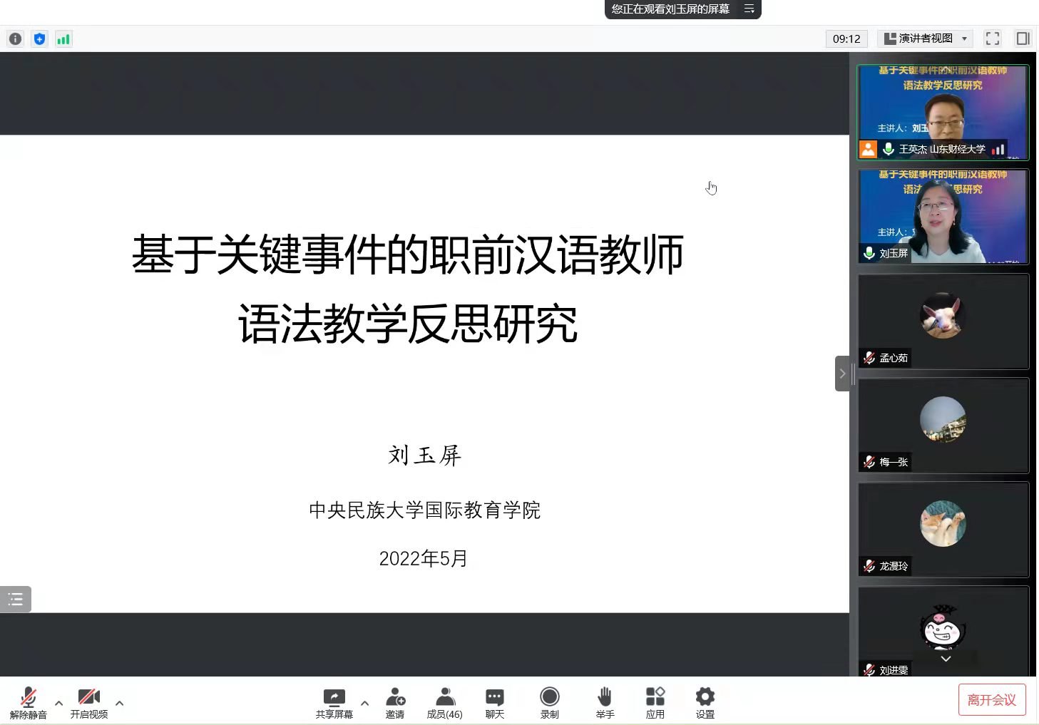 70周年校庆之际,5月26日下午,中央民族大学刘玉屏教授应我院邀请进行了“基于关键事件的职前汉语教师语法教学反思研究”线上专题讲座。讲座由国际教育学院院长助理王英杰主持,学院一线教师、汉语国际教育硕士研究生及部分高年级本科生参加了此次线上讲座。