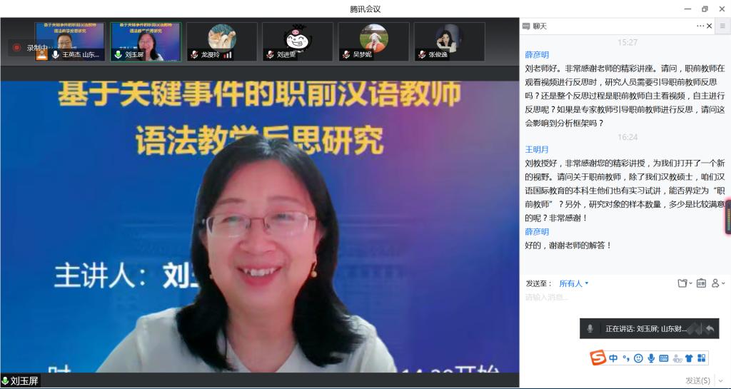 讲座伊始,刘老师首先介绍了该专题的研究背景与研究意义,阐释了“教学反思”与“关键事件”两个重要概念,针对目前国际汉语教学领域的教学反思研究缺乏对教学具体方面的深入分析的现状,开展了基于关键事件的职前汉语教师语法教学反思研究。随后,刘老师围绕研究对象、数据收集方法、研究问题、分析框架等方面详细阐述了该课题的研究设计,并从内容、层次、特点三个维度出发,根据实证研究数据探讨了职前汉语教师的语法教学反思情况,尤其强调了教师话语、教学内容、教学行为有效性、学生语言水平等职前汉语教师语法教学反思内容中关注度较高的方面。随后,结合实例介绍了技术性反思、实践性反思、批判性反思三个反思层次,并据此归纳了当前研究映射出的语法教学反思特点。最后,刘玉屏教授根据研究结论列出语法教学反思对职前教师语法教学能力发展的几点启示,比如借助关键事件促进教师反思、丰富反思内容,提高反思质量、开展教学反思研究等。