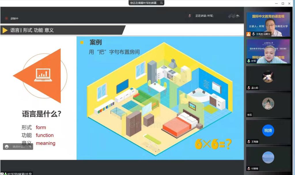 6月15日,我校70周年校庆之际,华东师范大学国际汉语文化学院叶军教授应邀为我院师生作“国际中文教育的语言观”线上讲座。讲座由国际教育学院院长助理王英杰主持,学院一线教师及汉语国际教育硕士生参加了本次讲座。