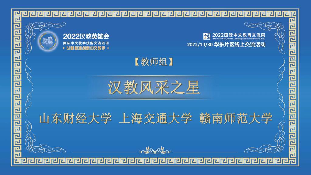 2022年9月,国际教育学院汉教教师代表队参加由教育部中外语言交流合作中心、全国汉语国际教育专业学位研究生教育指导委员会联合主办,华东师范大学承办的2022“汉教英雄会”,斩获佳绩,并于2022年10月30日上午代表山东财经大学在华东片区线上交流活动中精彩亮相。