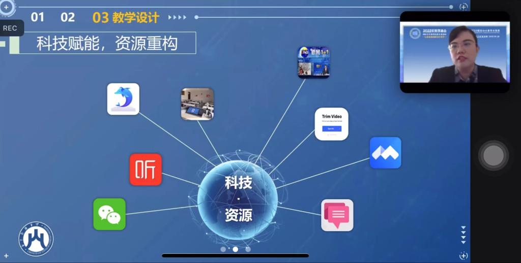 王明月老师作为团队代表进行交流汇报。汇报内容主要从“团队介绍”“课程简介”“教学设计”三个层面展开。课程及教学设计紧密围绕2022汉教英雄会活动主题“以新标准创新中文教学”,以《国际中文教育中文水平等级标准》中提倡的变革创新精神为指导,进一步结合新《标准》对高级“听”的能力的具体要求,从“理念变、方法变、内容变”三个层面,凸显“科技赋能,资源重构”“产出导向,效率提升”“润物无声,思政融入”设计亮点。