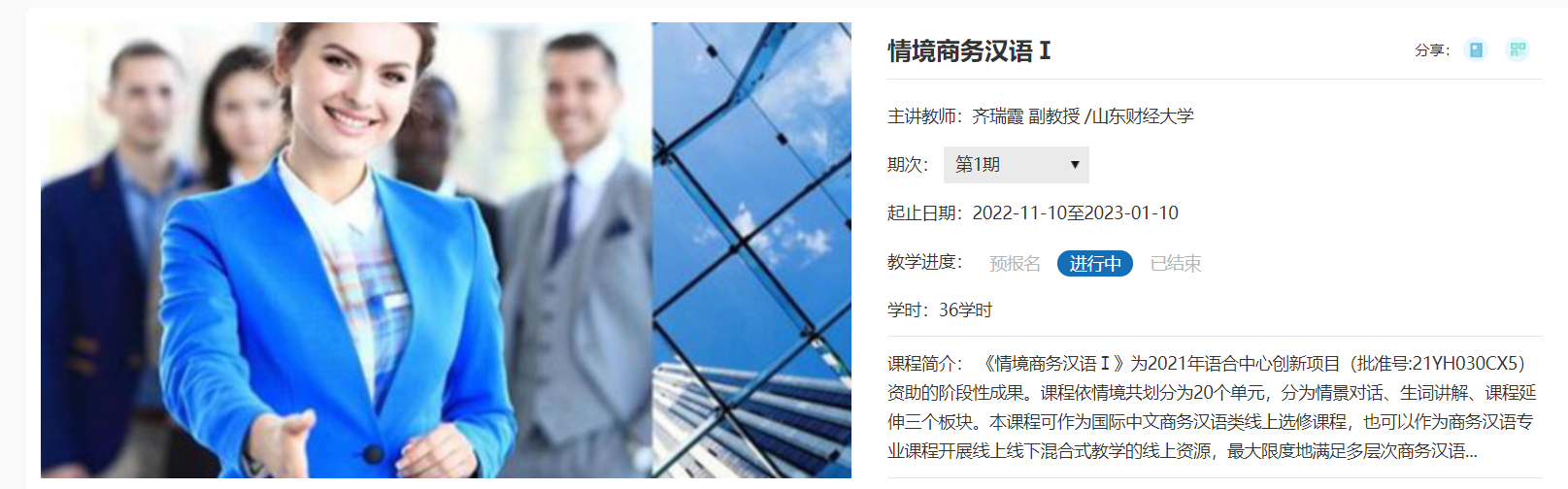 《情境商务汉语Ⅰ》由学院齐瑞霞副教授团队建设而成,是学院2021年教育部语合中心创新项目(批准号:21YH030CX5)资助的阶段性成果。课程严格执行《山东财经大学在线开放课程建设与教学管理办法》中相关规定,重点在知识结构、内容整合、教学设计等方面进行科学规划和创新探索,制作了教学视频、课程PPT、章节测验、作业库、试卷库等线上共享资源。主讲教师团队均由教学经验丰富的一线教师组成,达到了学校认证标准要求。