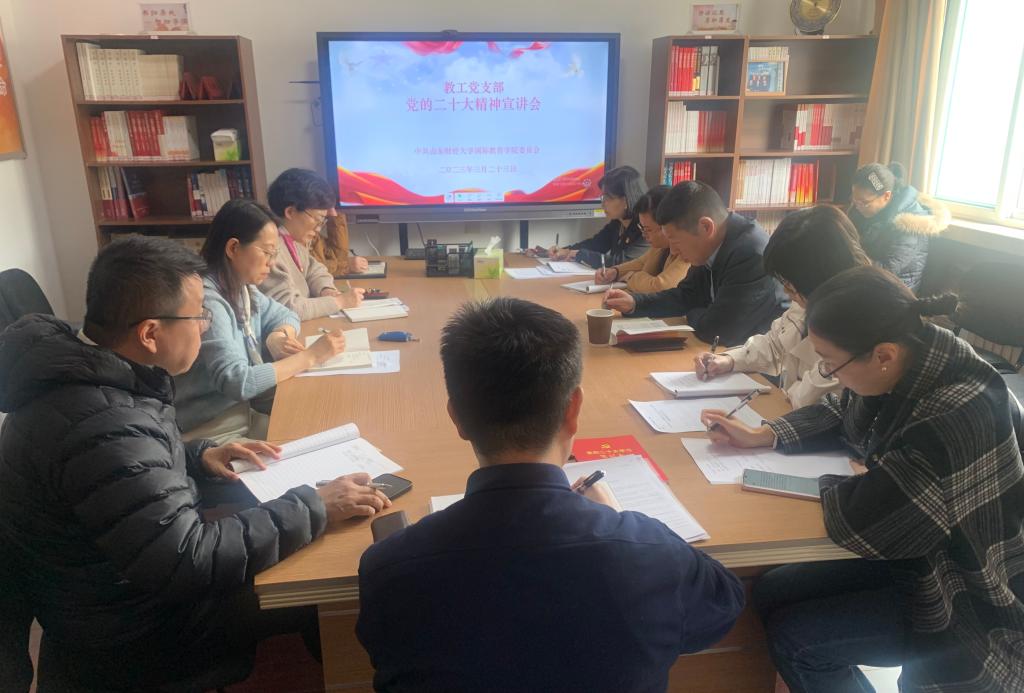 3月23日下午,副校长陶虎到国际教育学院教工党支部宣讲党的二十大精神,国际教育学院领导班子与教工党支部全体党员参加宣讲活动。