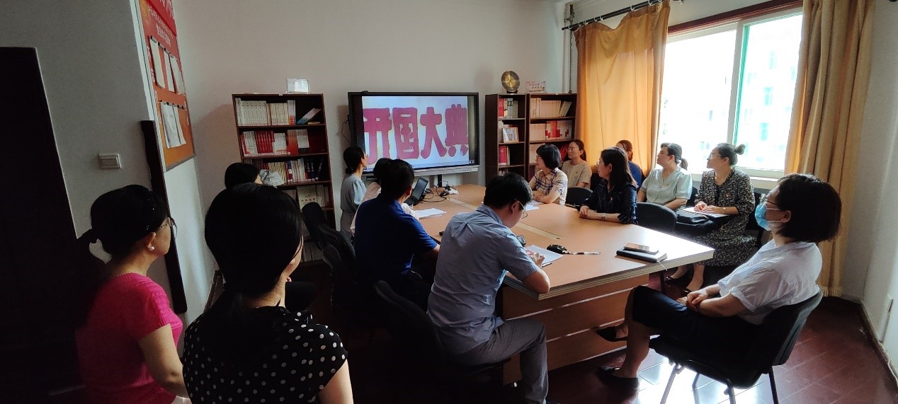 在学院党委书记张红燕的带领下,学院全体党员面向鲜红的中国共产党党旗,举起右拳庄严宣誓。重温入党誓词,昭示着共产党人坚定不移的理想信念,不仅是对入党誓词的再次确认,更是对党员身份的深刻认同和坚定信仰的再次表达。随后,全体党员共同观看了电影《开国大典》。影片真实再现了新中国成立的伟大历史时刻。