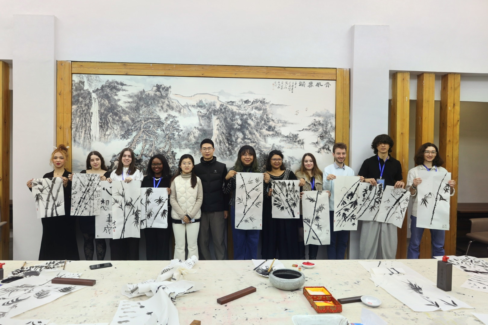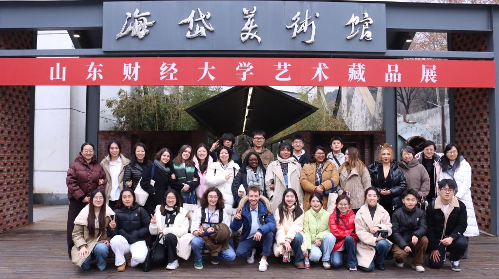 仪式结束后,法国“汉语桥”访团与我校学生志愿者共同欣赏了体育学院学生带来的精彩武术表演,双方轮番献唱中法经典歌曲,开展篮球互动小游戏,现场气氛热烈,两国青年在欢声笑语中增进了了解与友谊。随后,访团一行走进海岱美术馆,参观“山东财经大学艺术藏品展”,在袁慧敏馆长的系统介绍下,近距离领略中国传统艺术魅力,并围绕展品踊跃提问、深入交流。参观结束后,大家前往艺术学院中厅参与国画创作体验,以笔墨为媒,为我校国际文化交流写下生动注脚。