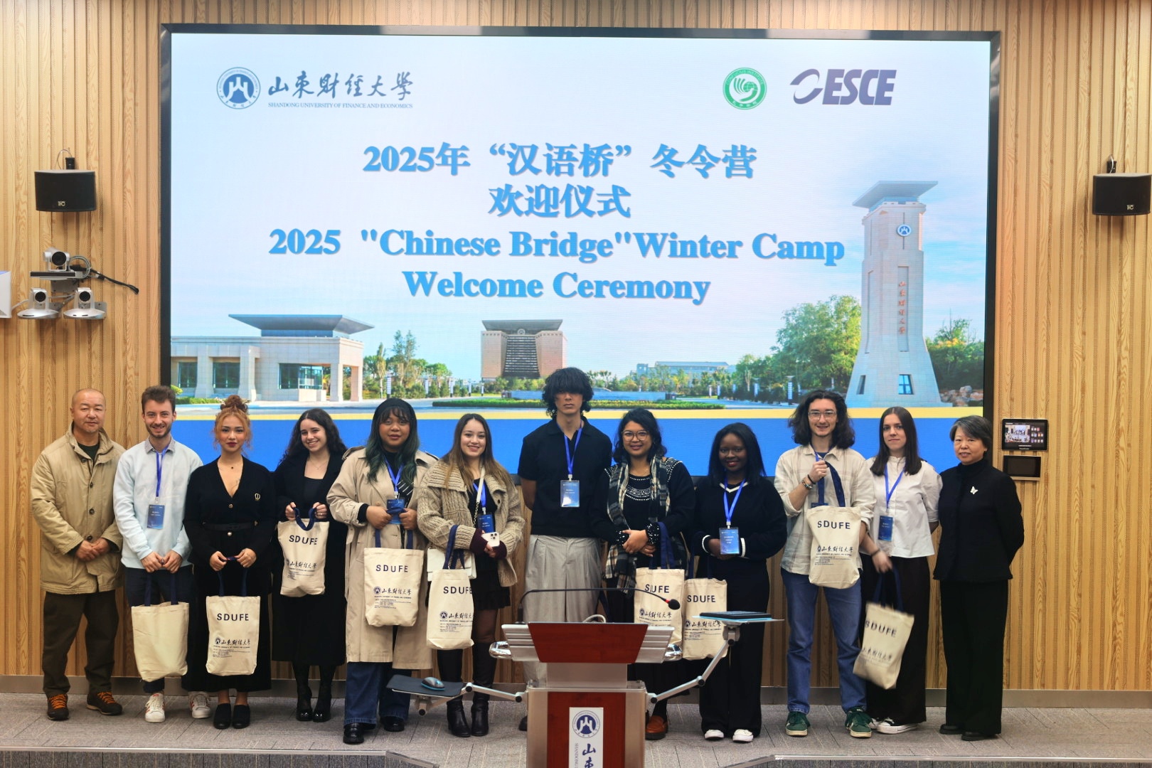 杨春晓首先代表学校向参加本次冬令营的全体师生表示热烈欢迎,他简要介绍了我校的基本情况以及山东历史文化、地理区位,并回顾了学校与法国高等对外贸易学院长期以来的交往历史,希望大家借助此次冬令营,进一步感知中国人文底蕴,在语言学习和文化体验中收获成长与友谊。解玲代表冬令营师生向两校的精心策划与周到安排致以衷心感谢,她勉励法国营员以好奇的目光观察中国、以开放的双手触摸中国,真诚融入并感受这片土地的古老文明与时代脉动。同时希望大家化身“文化大使”,把生动多元的法国故事带给中国朋友,以冬令营为桥,积极交流、用心体会,共享一段难忘旅程。