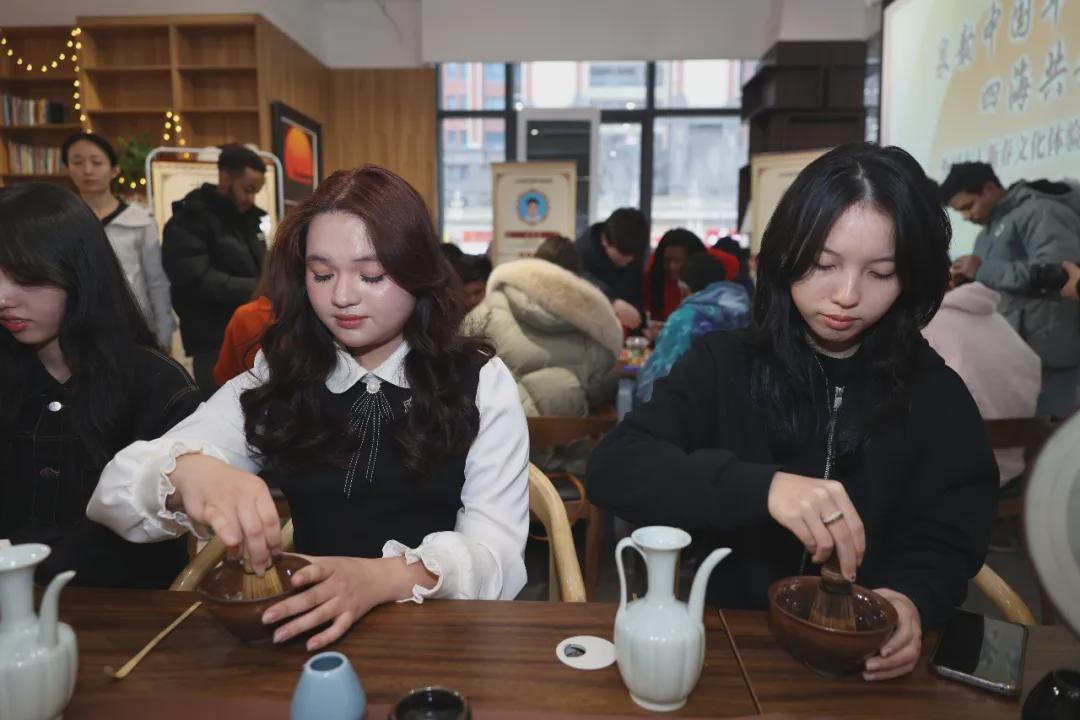 正山堂·超然红品牌携专业茶艺师翟凌霄老师,带领大家穿越千年,体验宋代点茶技艺。从认识点茶器皿、学习“七汤点茶法”,到亲手尝试在茶沫上创作“茶百戏”,外籍友人以茶为纸、以勺为笔,共同写下“新年好”吉祥字样,在茶香氤氲中领略宋人风雅与中式美学