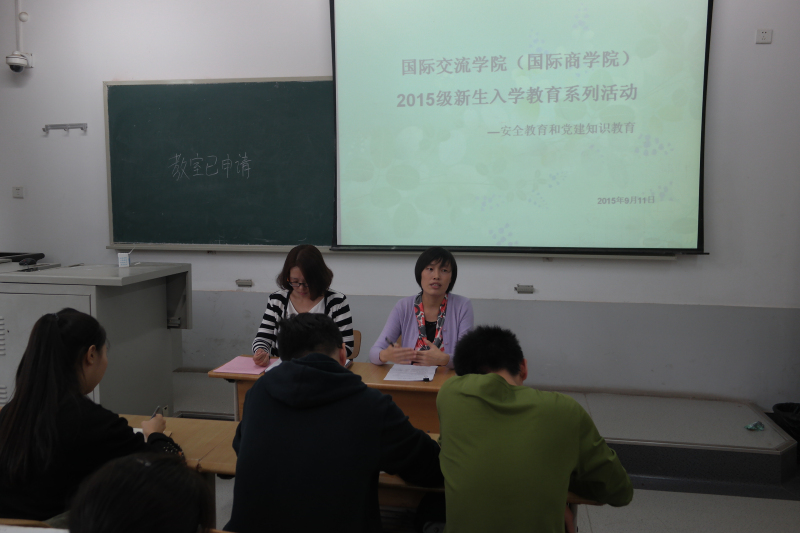 为了提高我院2015级新生的自我保护意识和安全防范意识,并促进新生对党建活动的认识,9月11日,国际交流学院(国际商学院)召开了2015级新生入学教育之安全教育和党建知识教育会议。出席会议的有学工办王坤老师及朱维霞老师,2015级全体新生听取了报告内容。