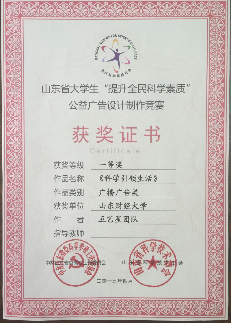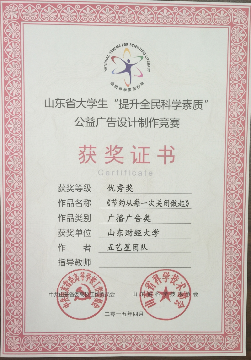 为了积极响应此次活动,围绕“节约能源资源、保护生态环境、保障安全健康、促进创新创造”主题,由国际交流学院田馨月、王一雯、徐嫣然、杨力帆和王昱凯5名同学组成的广播台“无艺星”团队,带着两部原创广播作品,一路过关斩将,在众多参赛作品中脱颖而出,最终,作品《科学引领生活》获得了此次竞赛山东省一等奖,作品《节约从每一次关闭开始》获得了此次竞赛山东省优秀奖。后续,获奖作品将择优在省市电视台、电台和全省数字科普终端播放,在有关场所挂展宣传。