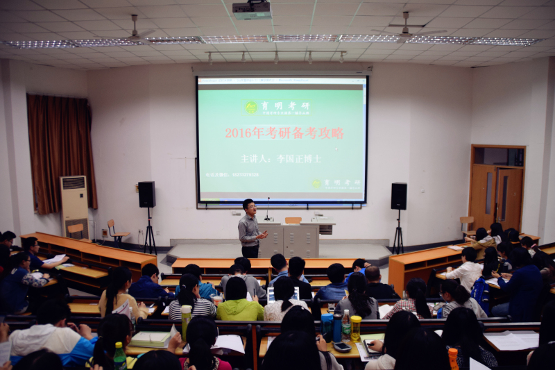 首先,李国正博士根据自己以往的阅卷经验就英语和政治两门学科进行了深入的分析,他从阅卷人的角度为同学们提出了自己的见解,也和同学们分享了答题技巧和经验。他指出,在距离考研还有八个多月的时间里,同学们应该有目地的来备考,并强调“态度决定一切”不打无准备之仗。随后,他以中国比较知名的高校为例,讲解了各大名校的招生计划,并结合学校的招生要求逐科进行讲解,清楚的分析了同学们的优势以及要克服的困难。最后,他为同学们报考什么样的大学提出了中肯的建议,并要求同学们结合自己的实际情况报考。会议在他风趣幽默的讲解和阵阵掌声中圆满结束,同学们也在这次辅导中得到了专业的指导和考研的信心。