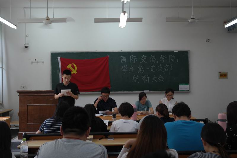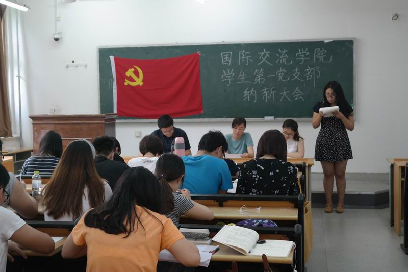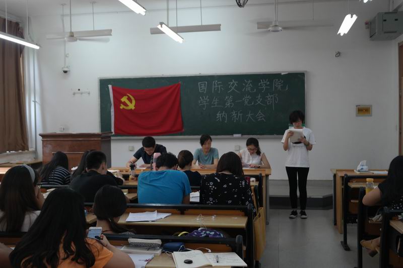 2016年6月7日中午,国际交流学院(国际商学院)学生第一党支部在舜耕校区2107教室召开了支部大会,会议主题是吸收预备党员,支部全体学生党员和本期发展对象参加。大会严格按照接受预备党员的支部大会程序进行,最后经全体正式党员无记名投票表决,一致同意接收本期7名发展对象成为中共预备党员。