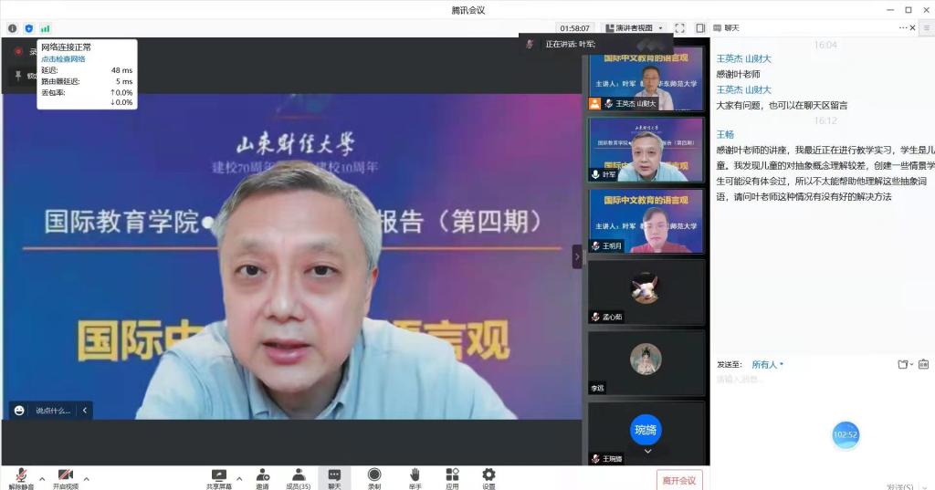 讲座最后,叶军教授耐心回答了在线师生提出的问题,鼓励大家以新的语言观和教学理念引领教学实践。此次讲座更新了师生国际中文教育的语言观,指导师生以新的语言观投身国际中文教育。