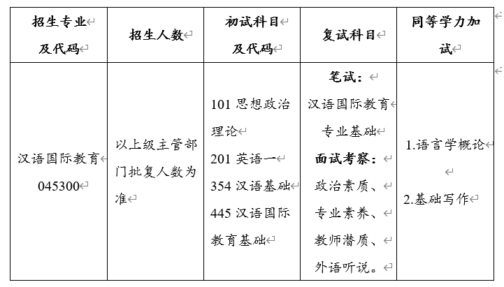 培养目标:培养具有熟练的汉语作为第二语言教学技能和良好的文化传播技能、跨文化交际能力,适应汉语国际推广工作,胜任多种教学任务的高层次、应用型、复合型、国际化专门人才。