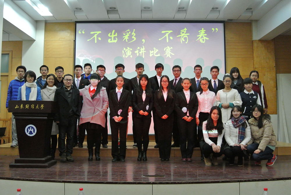 12月13号下午,由国际教育学院社团部、我校社团联盟、山东大学、山东师范大学共同主办的“不出彩,不青春”演讲比赛决赛在燕山校区3号报告厅顺利举办。本次比赛的评委为:我校三月文学社会长韩超、我校演讲与口才协会会长吴晓、山东大学演讲部部长崔宇贺、山东大学演讲协会会长任智伟、山东师范大学演讲队队长李芳妮、山东师范大学演讲协会会长王全海。本次比赛由我院社团部的王轶、吴保宏同学主持。共18名选手进行决赛,三校学生参加本次比赛。