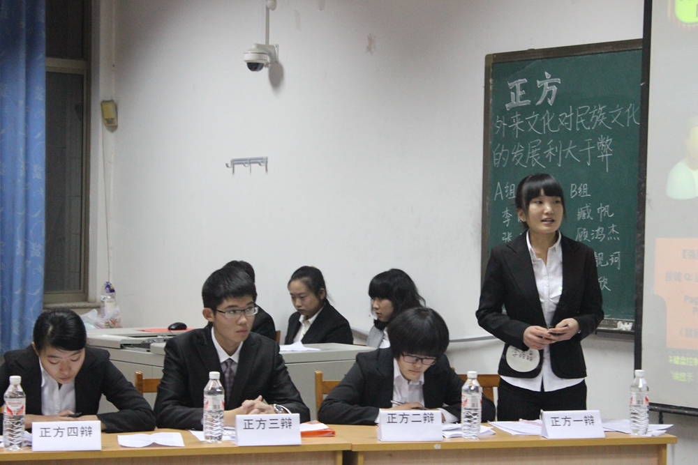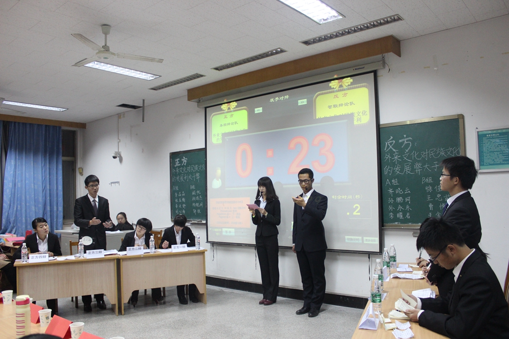 本次比赛由从复赛脱颖而出的四支队伍展开激烈的辩论。本四辩论队、智联辩论队、汉语国际教育辩论队及复仇者联盟辩论队围绕“外来文化对民族文化的发展利大于弊还是弊大于利”展开辩论。第一场比赛中,本科四班代表队对与智联队的一辩分别阐述己方观点,正方从外来文化对民族文化起积极作用的横向、纵向两个方面强调其益处。反方则着眼于对民族、社会的发展角度阐述外来文化的传入是有较大弊端。双方论证鲜明,多次运用引用、举例方法以理服人。第二场比赛中,汉语国际教育1301班代表队对复活者联盟队,在精彩的阶段小结中,正方针对用发展的眼光看问题、外来文化与民族文化的双向作用、文化侵略三个方面总结概括外来文化对民族文化影响的利。反方则举例强调个别现象、造成文化融合的原因等方面力证外来文化对民族文化的弊大于利。正方出口成章,理论清晰,论点明确。反方思路严谨,巧舌如簧。双方针锋相对,你来我往,陈词慷慨激昂的精彩表现令观众们激动不已,在观众提问问题时,同学们各抒己见,提出自己的理解、指出辩手们运用不当的例子,现场智慧的火花随处可见,辩手们精彩表现为观众们奉上一场饕餮盛宴。