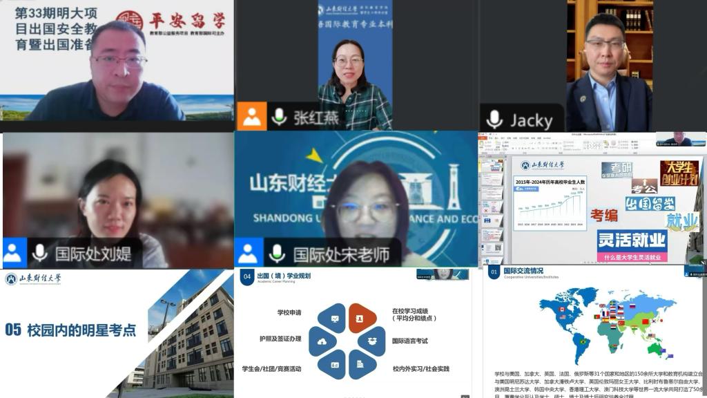 1月22日下午,国际交流与合作处与国际教育学院联合举办的“2025年学生出国(境)项目交流会”在线顺利举行。交流会由国际教育学院党委书记张红燕主持,国际交流与合作处处长、国际教育学院院长杨春晓,以及国际交流与合作处项目负责教师宋晓、姜伟宏、刘媞等出席了此次交流会。交流会持续了近三个小时,吸引了我校130余名学生、教师及家长的积极参与,为有志于出国(境)学习的学生提供了全面、系统的指导。