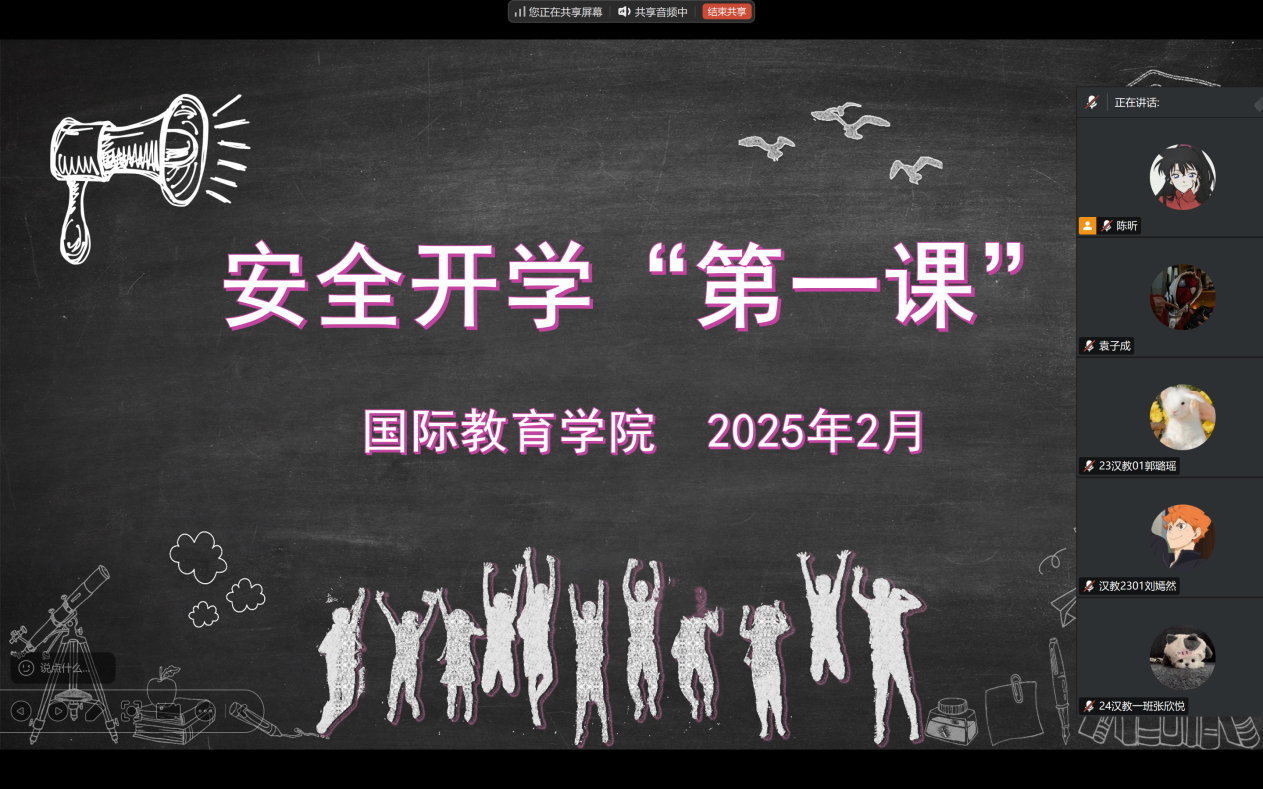 为保障本学期各项学生工作平稳开展,增强学生的安全防范意识,2月23日-24日,国际教育学院积极响应学校号召,通过线上线下召开班会、座谈会等形式,组织学生开展安全开学“第一课”主题班会活动,党委副书记王伟、辅导员高瞻及国际教育学院全体学生参加。