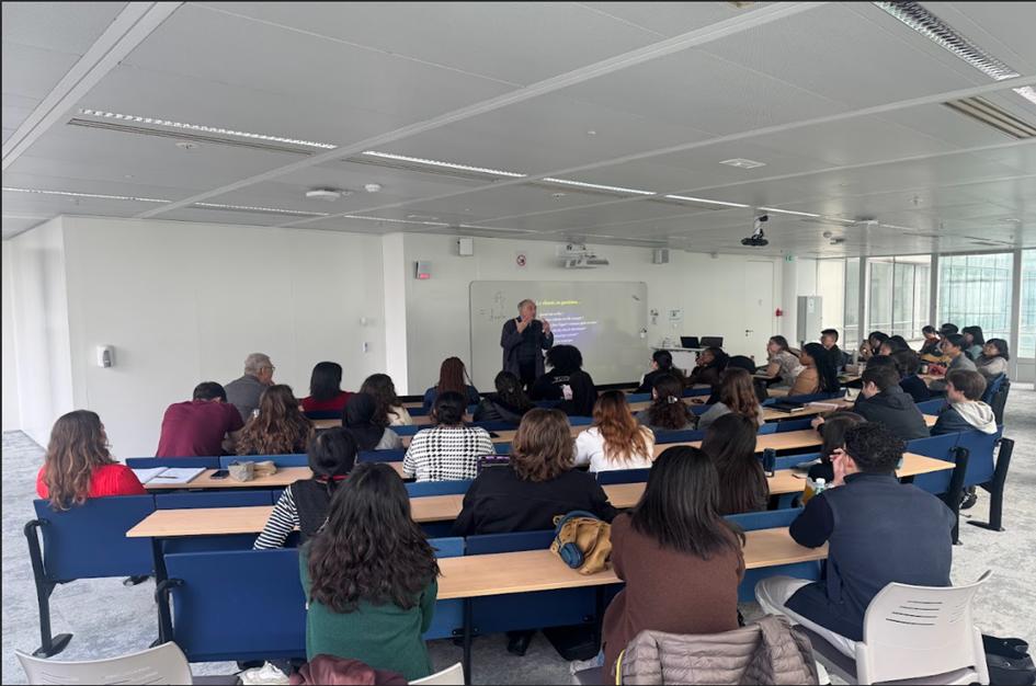 3月11日上午,著名汉学家Joël Bellassen(白乐桑)莅临ESCE孔子学院,为在场师生带来了一场主题为“用中文交流、书写与思考”的精彩讲座。ESCE副校长费特朗•纪尧姆主持讲座。他对白乐桑教授的到来表示热烈欢迎,并高度评价其在法国汉语教学和中法文化交流领域做出的杰出贡献。我院三位研究生张佳雯、蔡妙仪、宋一彤作为山东财经大学国际教育学院公派交换生,与ESCE学校的中文学生共同参与了此次专题讲座。