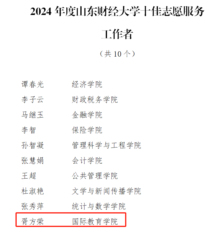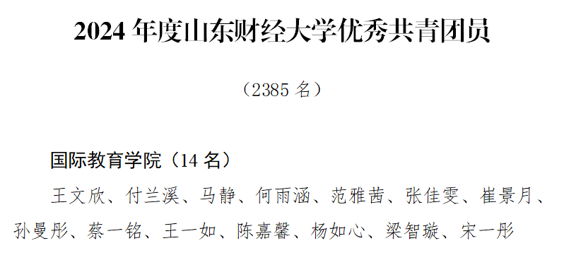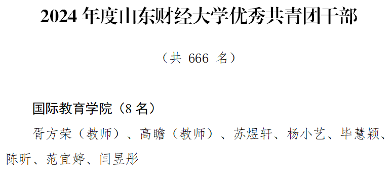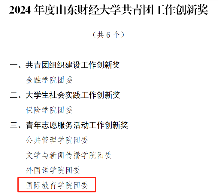 在此次表彰大会上,国际教育学院师生展现出蓬勃向上的精神风貌与卓越成就,以实际行动诠释当代“五四精神”,获得多项集体与个人荣誉。我院团委荣获2024年度山东财经大学共青团工作创新奖团委、十佳团支部1个、优秀共青团干部8名、优秀共青团员14名、十佳志愿服务工作者1名与优秀志愿者1名。