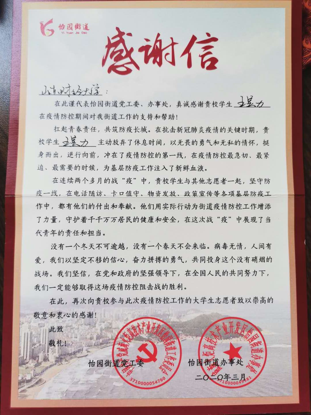 祝金欣同学在山东省蓬莱市蓬莱阁街道担任疫情防控志愿者,本着一颗认真、热心、奉献的心,多日以来,她在蓬莱阁街道小区物业每天对进出车辆、人员进行细致的把控,逢人必问、逢车必查。她坚守岗位,风雪无阻,尤其是在蓬莱2月15日暴雪中仍坚守在一线进行扫雪、通行证的检查和体温的测量;在阴雨天气打着雨伞,连续多天参与车辆通行证的填报任务;同时她还参加了物业的快递、外卖的登记、储放、分配等各项工作。
