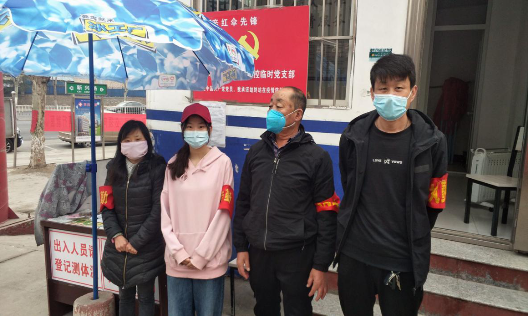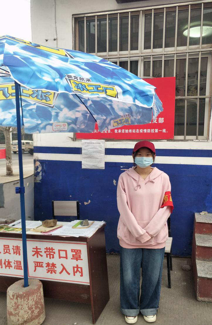 张慧同学在所住的社区志愿参加抗疫防疫志愿活动,在社区门口搭建的临时检查处检查来往群众是否有不戴口罩情况、劝导群众出门戴口罩,登记非本社区人员及车辆的进出情况,并为进出社区人员测量体温。