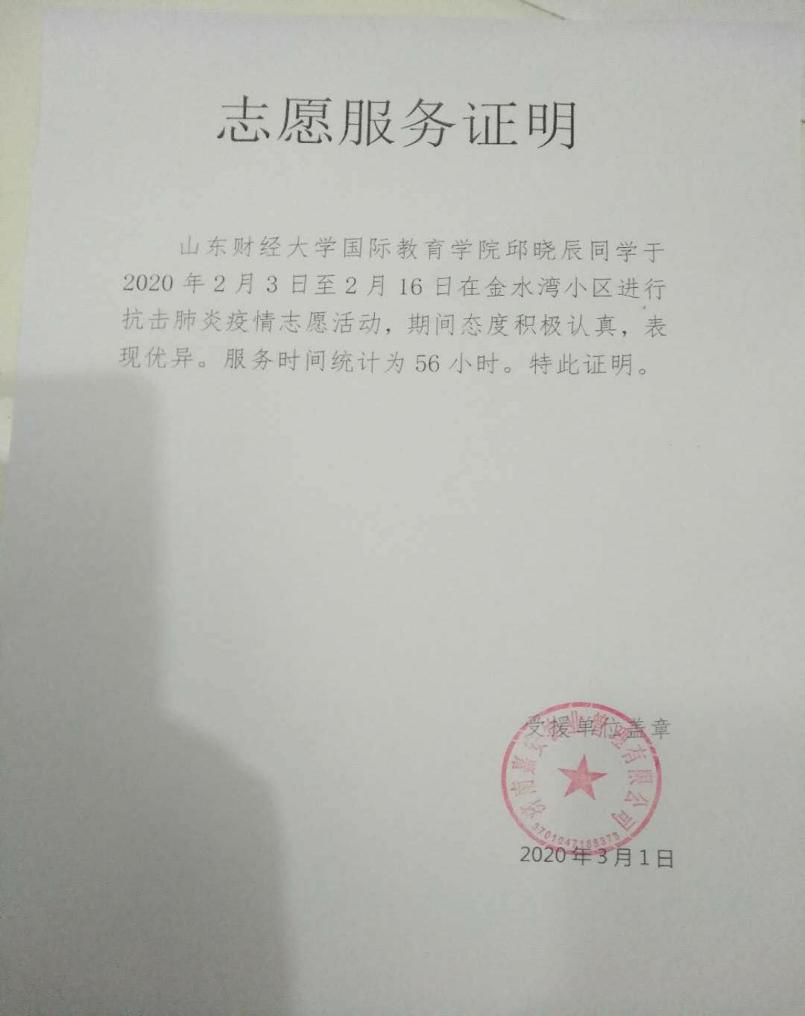 由于今年年初新型冠状病毒肺炎疫情的蔓延,金水湾小区需要做消毒工作的志愿者,所以邱晓辰同学积极报名参加了此次抗击新冠肺炎疫情志愿活动。在2月3日到2月16日期间,每天上午8点到10点,下午3点到五点。她都准时到小区物业,背上喷雾器到自己所属的区域进行消毒工作。这份工作虽然很枯燥,冬天的户外温度也比较低,但是一想到在抗疫一线的医护人员,他们的工作更辛苦,甚至还有暴露被感染的风险,况且这是一项可以为社区为大家作出贡献的工作,于是邱晓辰同学还是日复一日地坚持下来了。她的妈妈是一名护士,十七年前她曾经参加过抗击非典疫情工作。没想到十七年后,自己也参加了此次抗击新冠肺炎疫情志愿活动。