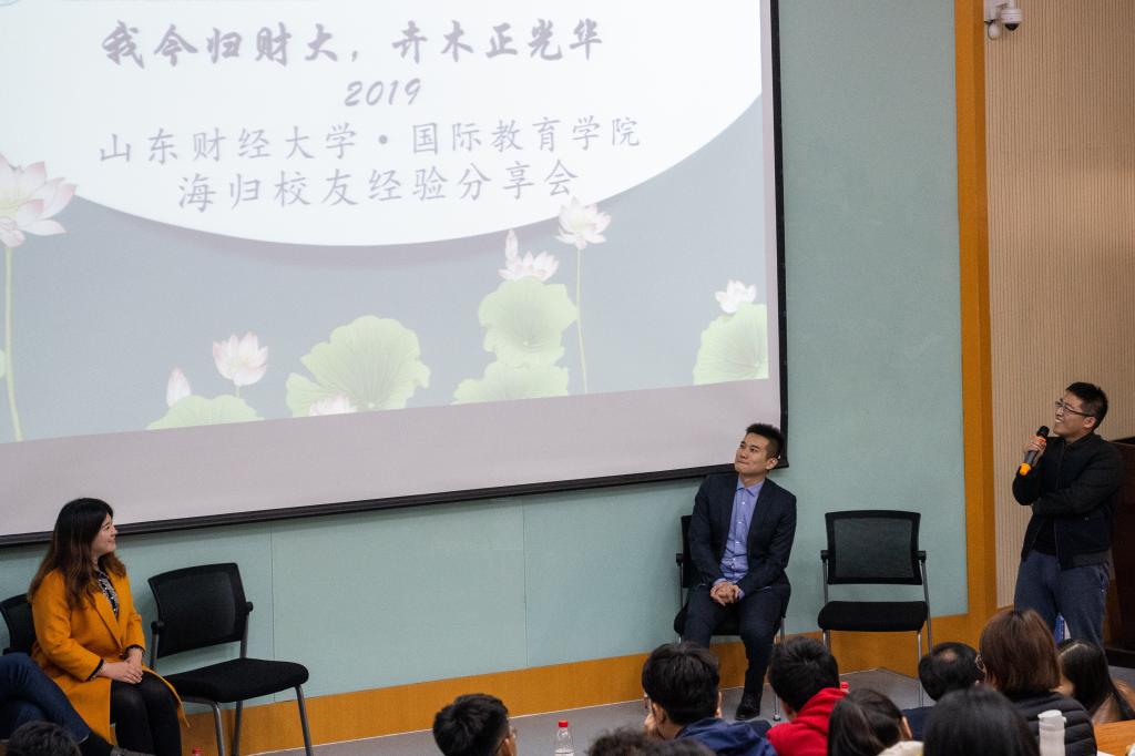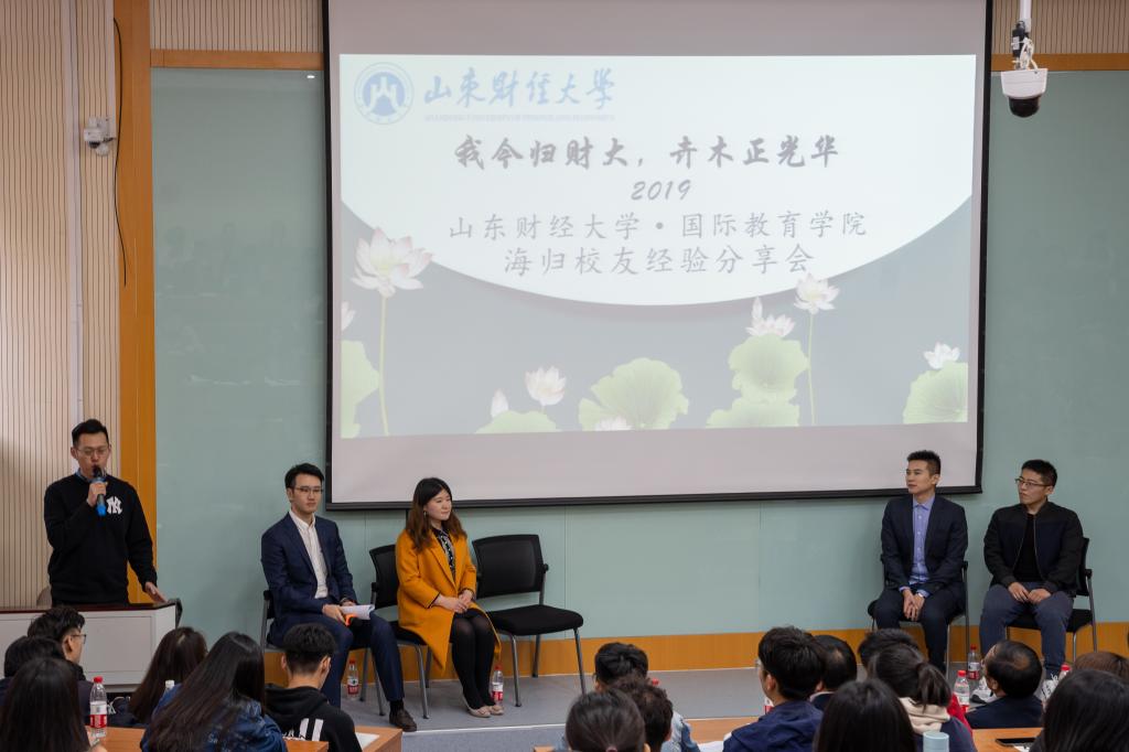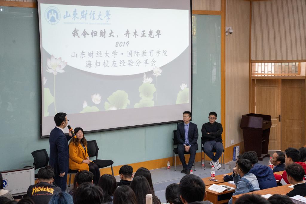 为了进一步加强学院特色文化建设,增进学院与校友的之间的交流和联系,我院于11月10日在舜耕校区第三阶教室举办2019年海归校友论坛。出席的领导和老师有山东财经大学合作发展处处长刘奇耀、国际教育学院党委书记张建和团委书记钟毓卓,论坛特别邀请了我院4名优秀校友,分别是2010级中加项目孟令辰、2011级中加项目韩淼旭、2012级汉教专业屈逸飞、2014级中新项目李响。论坛由2015级中加项目杨馥瑞主持。