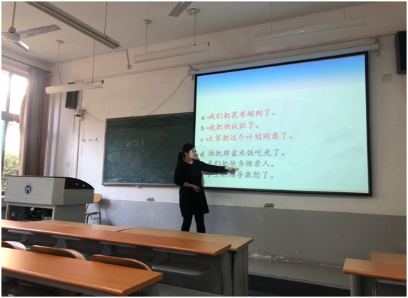 今年新进博士王明月老师代表青年教师讲课,就现代汉语常用句式“把”字句,从“把”字句的定义、特点及汉语作为第二语言教学角度进行汇报,在座教师进行点评,并提出改进意见。