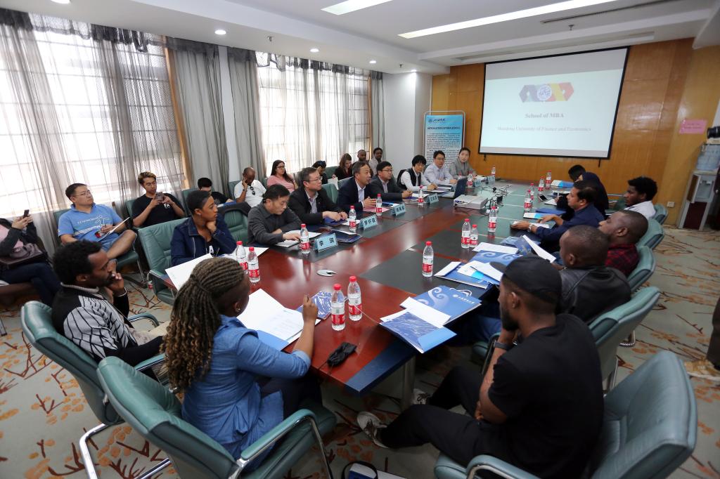 报告会后,考察团成员分三组与专家和企业家进行座谈交流。政府组的座谈由国际经贸学院院长王培志主持,山东省宏观经济研究院战略规划所所长刘德军、济南市投资促进局统计考核处处长张屹分别介绍了山东省经济转型发展状况和济南市优化营商环境情况。来自阿根廷、赞比亚、老挝和马拉维等国家的政府工作人员和企业家针对感兴趣的问题与专家进行了深入交流,加深了对山东省扩大对外开放、扶持外资经济发展政策的了解。MBA组的座谈由MBA学院院长陈保启主持,济南海纳特科技有限公司董事长王如孟、山东盐业集团公司电子商务公司董事长王华和泰华智慧产业集团股份有限公司总裁郝敬全担任座谈嘉宾。来自巴基斯坦、孟加拉国、利比里亚、捷克和肯尼亚等国家的政府工作人员和企业家围绕政府公共政策和企业经营方面的问题进行了交流。第三组座谈由数学与数量经济学院院长安启光主持,烟台九如泰国际贸易有限公司董事长隋方柏、工商管理学院副教授、山东松乔餐饮管理有限公司董事长窦大海和山东大榕树文化发展有限公司总经理何琪担任座谈嘉宾。来自蒙古、阿富汗、阿曼和埃塞俄比亚等国家的成员与企业家积极互动,有来自外贸公司的考察团成员与中国企业家现场达成初步合作意向。考察团成员对中国及山东经济社会发展给予充分肯定,希望中国开放的步伐越迈越大,促进中国和各国之间的共同繁荣。