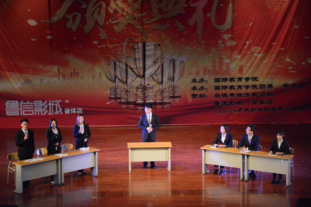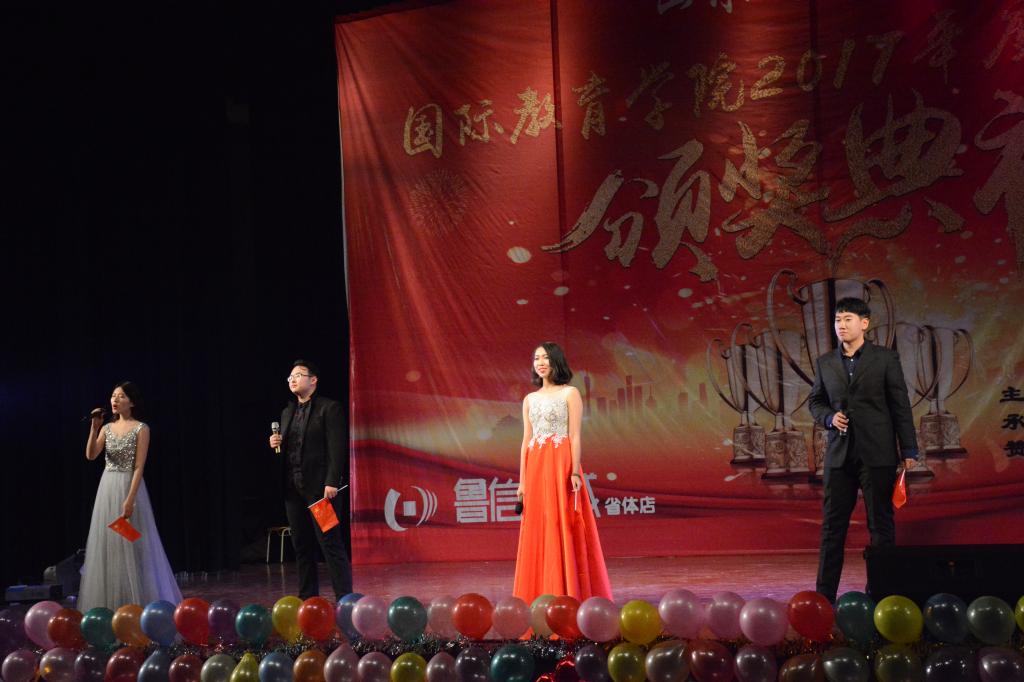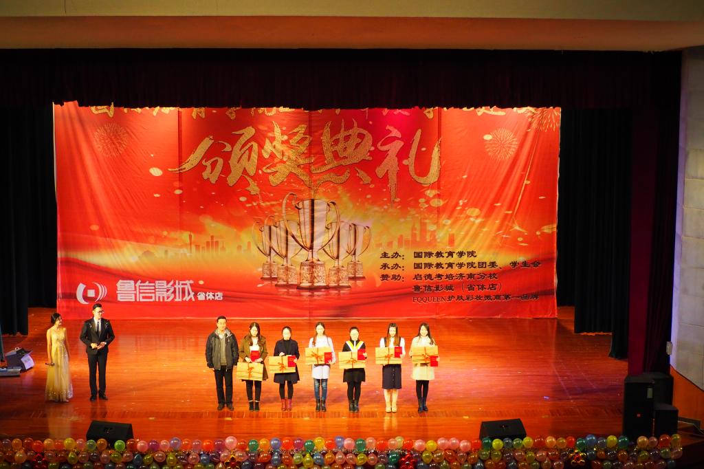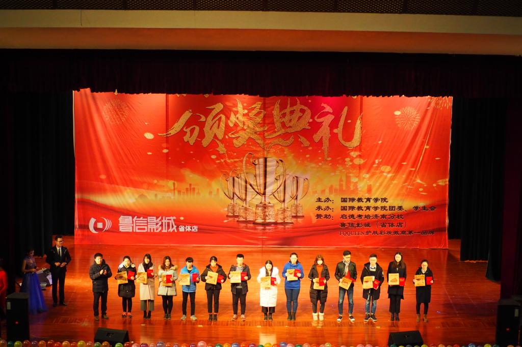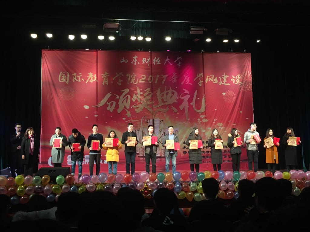 我院一直高度重视学风建设,开拓创新,多措并举,通过评优表彰大会、创建“无手机课堂”、排演原创话剧《考试众生相》、致学生家长的一封公开信、创建学生家长微信群、签署诚信考试承诺书、召开学风建设主题班会等各种创新活动对我院学生加强学风建设,取得了显著成效。为表彰我院优秀学子,体现榜样的力量,塑造优良的学风,严肃考风考纪,我院于2018年1月6日在舜耕校区礼堂举办了国际教育学院2017年度学风建设颁奖典礼。出席颁奖典礼的有山东财经大学学生工作处处长王剑,山东财经大学团委书记刘奇耀,山东财经大学国际教育学院院长刘增美,党委副书记张红燕,院长助理王英杰,院长助理段博元以及全体辅导员老师。国际教育学院全体同学参加本次颁奖典礼。
