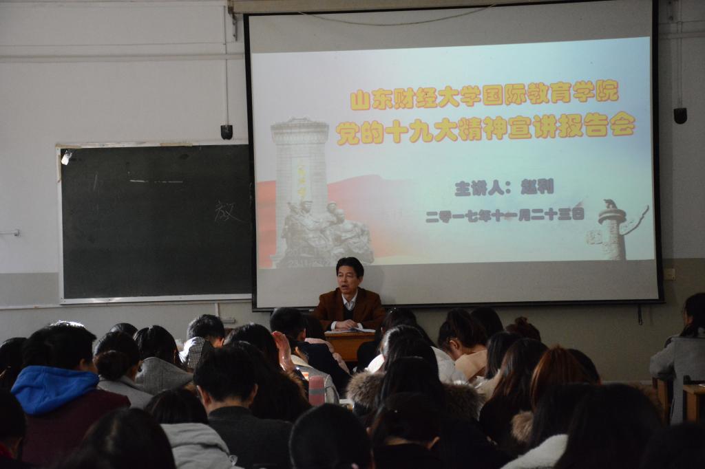 为深入学习宣传贯彻党的十九大精神,使我院学生深刻领会和学习党的十九大精神,11月23日下午2点在燕山校区1207教室,山东财经大学学习贯彻党的十九大精神宣讲团成员、国际教育学院党委书记赵利,为国际教育学院全体学生党员、本期党员发展对象、入党积极分子和学生骨干等,做了题为“认真学习党的十九大精神,争做新时代社会主义合格建设者和接班人”的宣讲报告会。国际教育学院党委秘书赵立霞主持。