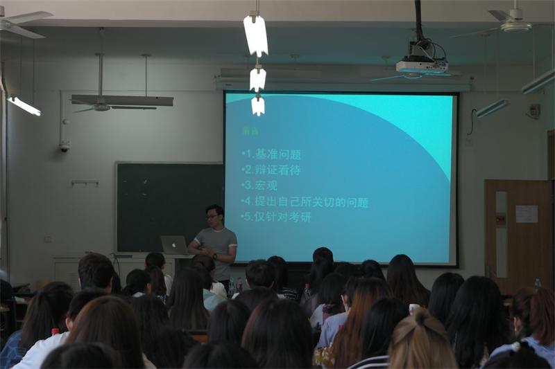 张安可成功被首都经贸大学录取为研究生,他就国内考研是什么、为什么、怎样做三个大方面进行了阐述,他指出考研形式多样,学生可以通过考研开拓眼界、拓展人脉,在复习阶段,他建议同学们要做好总结,控制时间,找到适合自己的答题模式。