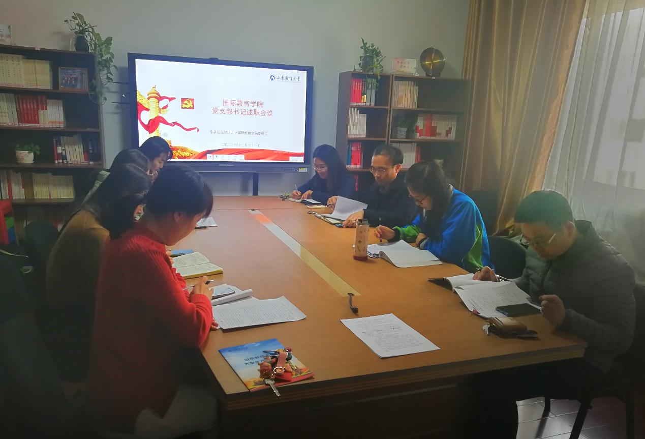为深入学习贯彻习近平新时代中国特色社会主义思想和党的十九届六中全会精神,压实党支部书记履职尽责能力,12月31日下午,国际教育学院党委在舜耕校区干训楼9402会议室召开2021年度党支部书记述职评议会。学院党委领导班子成员和各党支部书记参加会议。