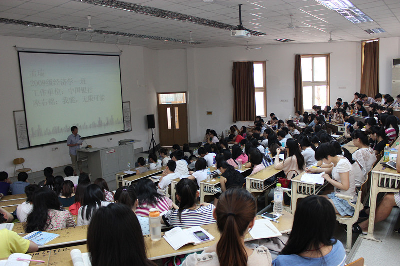 会上邀请了09级中加班11位优秀学生代表为10级中加全体同学和11级中加部分同学分享他们的学习和就业等方面的经验。09级经济学1班的卢红蕾和2班的王政同学针对公务员考试分别从笔试和面试两个方面分享了各自成功的经验。09级经济学1班张敏、2班的左思明和3班的王诗嫣针对国内考研分享了她们成功的考试经历和成功的心得。09级经济学1班的孟瑞、2班的解洋和3班的赵晢伊跟大家分享了就业方面的经验。09级经济学1班的高大海、赵亚宁和周禛就国外申研分别提出了自己的看法,分享了各自出国深造的心得和体会。
