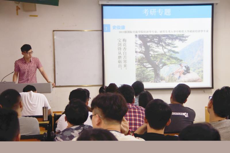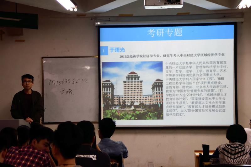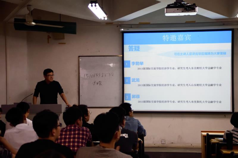 交流会包括四个方面:公务员考试、银行等金融行业就业、海外留学以及国内考研。我院2013级经济学的陈鑫和栾晓璠同学用风趣的语言给同学们简单讲解了公务员考试,包括笔试和面试,着重强调了心态的重要性,现场气氛活跃。经济学院2013级孙浩同学则以个人在银行申请方面的丰富经验,为同学们解答了许多银行业与金融方面的知识。我院2013级尹晗用她在大学时学英语的经历和申请国外名校时的种种,为将要出国留学的学子提供了宝贵的经验。考研专题中,经济学院的于曙光和李川川,以及国际教育学院的2013级史俊康和孟浩楠四位同学则用现身说法,为交流会画上了圆满句号。会上,同学们都在认真聆听,积极提问,学长学姐细心解答,现场气氛极其热烈。