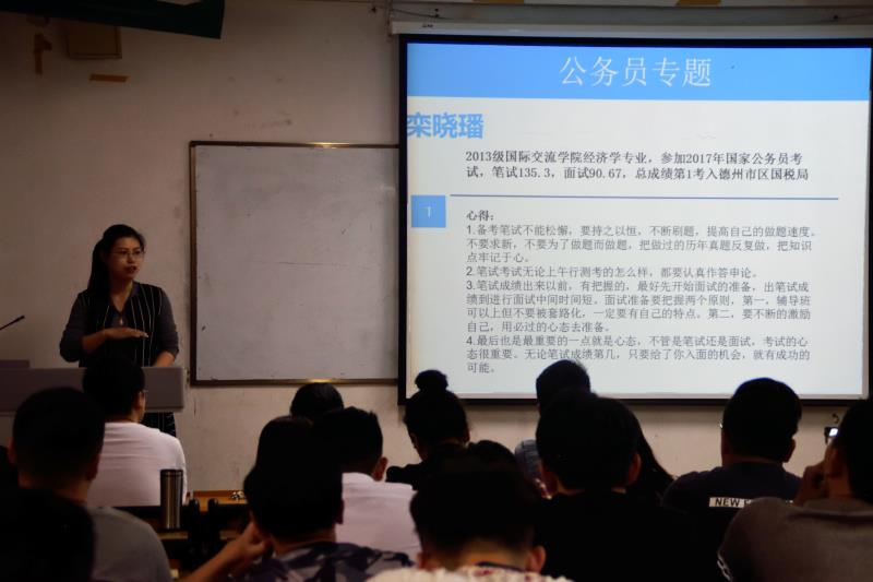 为我院学生分享就业及考研、出国等方面的经验,让学生对未来有一个更加清晰的规划,5月8日下午,我院在舜耕校区6317教室召开了2017年毕业生就业经验交流会。此次交流会由2013届学生会主席唐伟宸主持,会上特别邀请了我院和经济学院多名优秀毕业生,我院2014级、部分2015级和2016级学生参加。