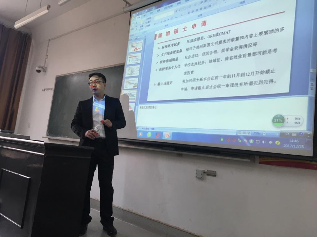 杨淼现任山东欧美教育咨询有限公司总经理,米云青现任山东欧美教育咨询有限公司留学部经理。说明会上,米云青对硕士留学的相关问题进行了详细介绍和说明,就自己在校学习及出国留学等方面与到场学生进行了深入交流,为有出国留学意向的同学普及了出国留学的相关知识,比如国家地区、学校、专业的选择。对于同学们的问题他也非常耐心的给出了意见。杨淼对即将参加2+2模式的中加班和中新班的同学出国前的准备事宜进行了一一解释和说明,使他们对未知的国外学习和生活有了一定的了解,有助于更好的准备。