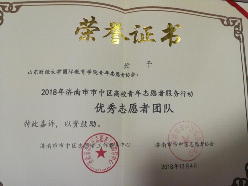国际教育学院青年志愿者协会用他们自己的方式服务着社会,这种服务社会、热心奉献的精神和行为,得到了社会的认可和肯定,多次获得优秀志愿者团队称号。2018年12月4日,国际教育学院青年志愿者协会参加了济南市市中区“城市提升 志愿未来”志愿服务年度双选会,并荣获市中区“优秀志愿者团队”荣誉称号。