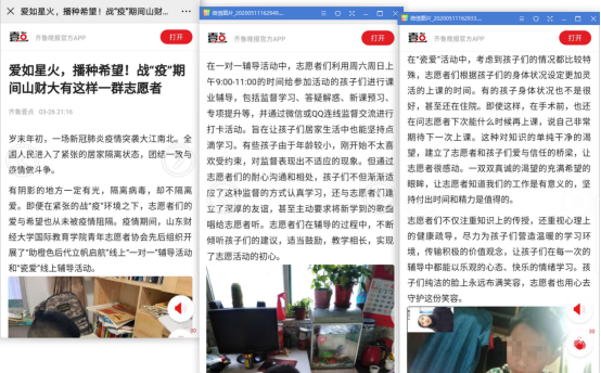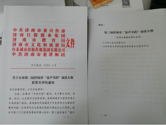 2020年3月,国际教育学院青协荣获第三届济南市童声童韵诵读大赛优秀志愿服务团队奖项。童声童韵诵读大赛是由中共济南市委宣传部、济南市文化局共同组织的建设“书香济南”的活动。国际教育学院青年志愿者协会组织志愿者总共参与3次活动,累计参与志愿服务的志愿者有48人,认真维持场地秩序、做好选手出入场引导,为比赛的顺利进行贡献了自己的力量,得到了大赛举办方的赞扬,成为全市唯一一个获得此荣誉的高校志愿服务团体。