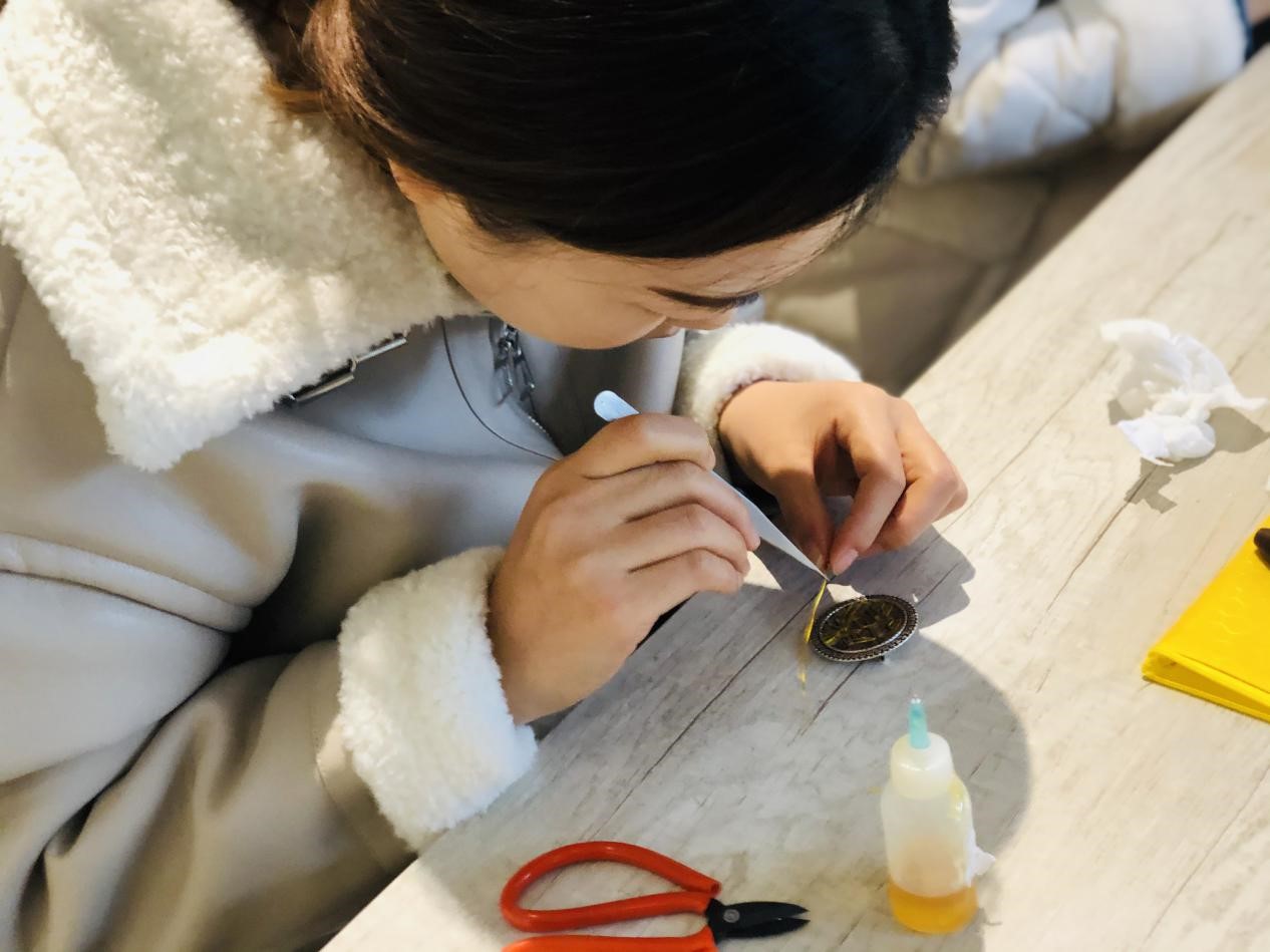百花洲的工作人员首先为陶艺组的学生讲解了龙山黑陶文化的悠久历史,接下来由专业老师进行陶艺制作教学。陶艺制作共分为五步,分别是定坯、拉坯、定型、装饰、晾干后烧制。在专业老师的指导下同学们完成了精美的陶艺作品。在掐丝珐琅组,专业老师先对中国掐丝珐琅的历史渊源及基本制作过程进行了介绍,并进行了制作示范。制作掐丝珐琅的主要步骤是掐丝、填色和定型。同学们在认真学习制作过程之后,便开始自己动手体验传统技艺的制作。经过两小时的学习以及在老师耐心的指导和帮助下,每位同学都完成了自己的作品,体验到了独具特色的传统工艺文化。虽然初次学习感觉不容易,但大家还是表现出浓厚的兴趣和耐心。同学们表示,通过亲身体验传统工艺的制作,感受到中国匠心独具的工匠精神和博大精深的文化底蕴,今后作为一名对外汉语教师,更要不断提高自身的文化自信,传播中国好声音。