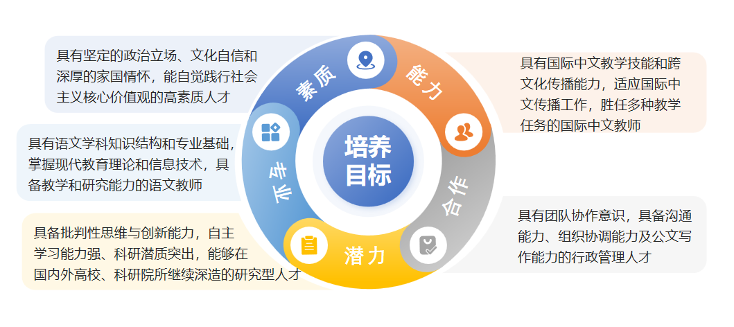 1.以宽口径、复合型人才培养为特色,关注学生的专业发展与职业能力提升,培养“一专多能”复合型人才。毕业生可胜任国内外各类学校、新闻出版、文化管理及其他企事业单位的国际中文教育、语言文化传播及中外文化交流等相关工作。