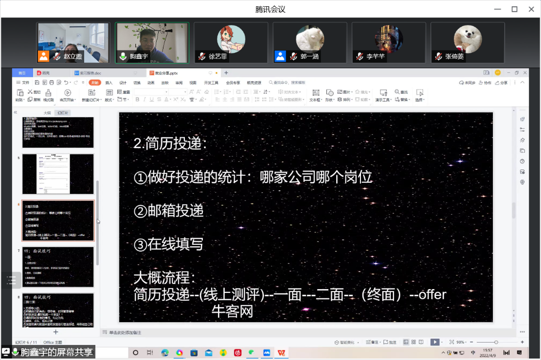 4月9日下午3点,我院2022届汉语国际教育专业本科毕业班于线上召开就业促进会,本次会议由赵立霞主持,特邀已经网签的2022届同学朱荣慧和朐鑫宇向汉教本班同学传授就业经验。