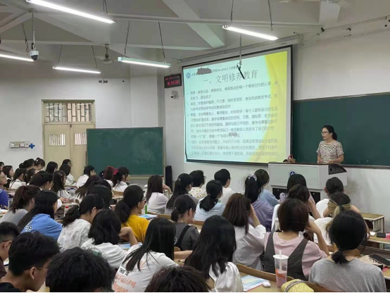 王坤从文明修养、法治安全等方面对新生进行了教育。她强调了遵纪守法的严肃性和重要性,要求新生严格遵守国家法规和校规校纪,不违法犯法,不违纪乱纪,严格要求自己,做一个作风正派、乐观积极、充满正能量的当代大学生。她鼓励同学们积极创新,参与各种科技创新活动和社会实践“三千计划”等实践活动,希望同学们通过各种科创竞赛及社会实践等活动不断提升个人综合素质。她还强调,作为大学生,要学会尊重他人,尊师重教,在集体环境中把握与人交往的尺度,处理好各种人际关系,明白“和而不同”的道理,不斤斤计较,要有肚量,做一个宽容大度的人。最后,她特别通过几个真实的诈骗案例提醒同学们要加强自身防范意识和保护意识,防止电信诈骗、网络诈骗等,保护好人身安全和财产安全。