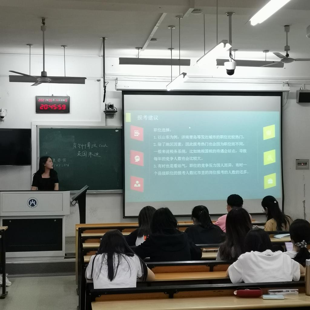 为了帮助低年级同学做好未来职业规划,对国内考研、出国读研等选择有明确的了解,提升同学们对就业的认知,帮助同学们明确自己的发展方向,5月14日晚,国际教育学院在舜耕校区2309教室举办了以“扬帆新征程,奋斗正青春”为主题的2021届中新会计学优秀毕业生经验交流分享会,会上特别邀请了2021届优秀毕业生陈鹤文、司敏、陈璐、于康宁、李晓,分别针对考研保研、出国留学、就业实习等方向进行了经验分享,2018、2019、2020级会计学(中新合作)专业学生积极参加。