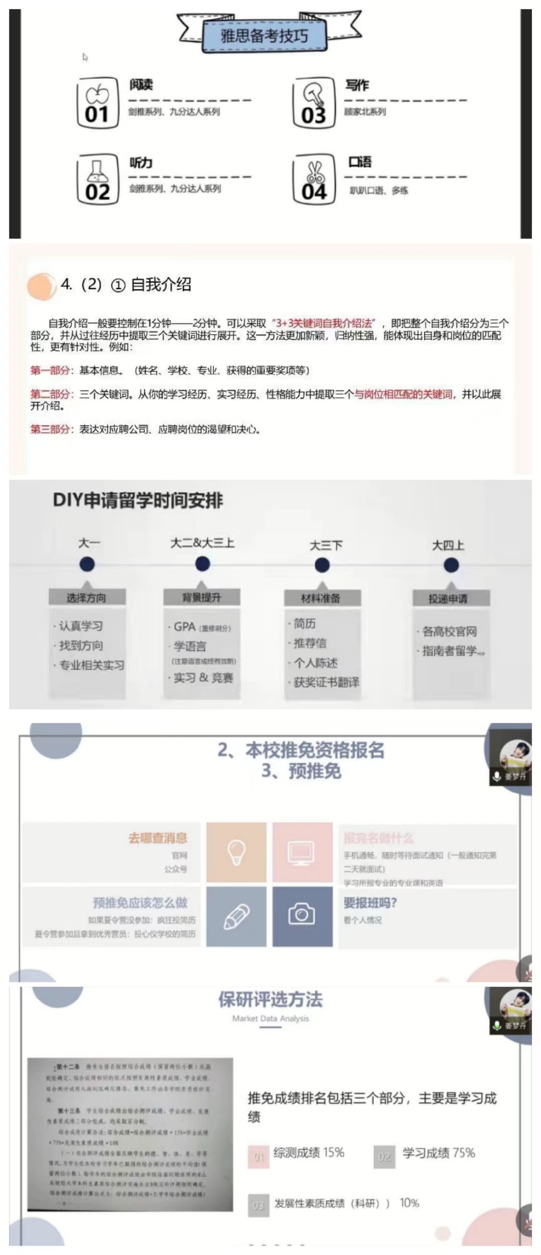 在中加经济专场中,推免至河海大学的姜梦丹同学介绍了有关保研的经验。确定是否具备保研资格,可以参照《本科生学生手册》中的“山东财经大学优秀应届本科生面试攻读研究生推荐办法”,有保研意愿的同学一定要提早确定自己是否具备保研资格,再之后就是了解保研流程并为之做准备。山东大学考研上岸的李姝璇、卢子君两位同学介绍了考研院校和专业的选择,首先应明确考研的目的,其次需确定专业考试科目,要充分认识到自己的优势和劣势,最后要认识自己的基础和毅力。作为客观因素的个人基础和主观因素的精神意志,都会影响选择。成功申请曼彻斯特大学的肖安琪同学有关出国留学讲到需要准备的材料:绩点,语言,实习,GRE/GMAT等,还要了解重要时间节点。对于就业,滕越同学分享了校招的流程、简历的撰写和笔试面试的技巧。
