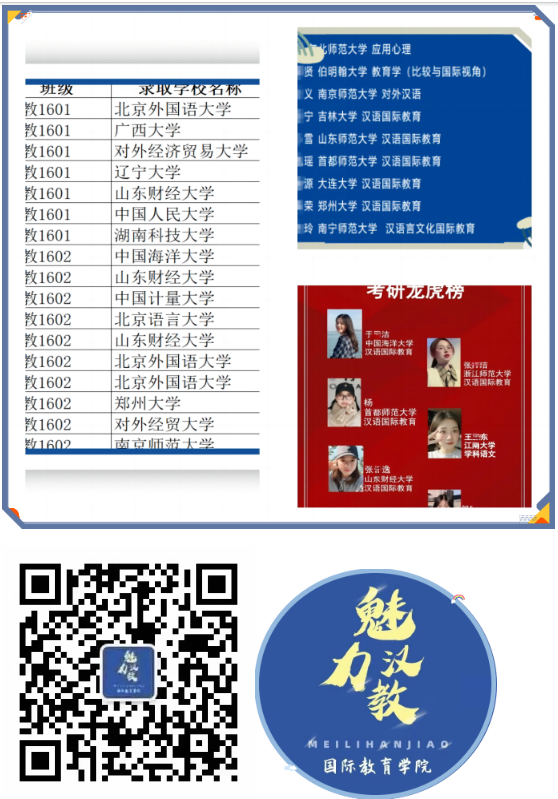 敬请关注国际教育学院“魅力汉教”公众号,我们精心策划了考研分享会、校友分享会、实习经验交流分享等系列活动,全方位展示汉语国际教育专业毕业生在深造与就业方面的风采与成就。期待您的参与!