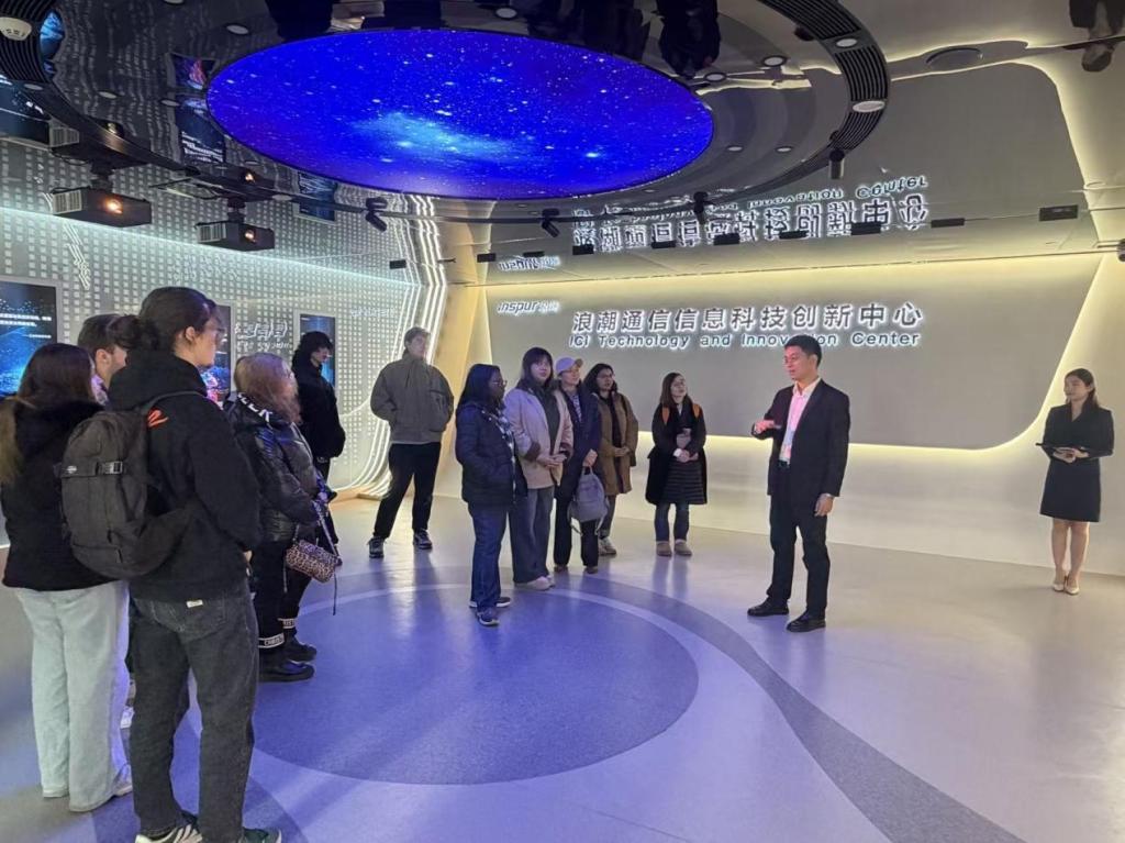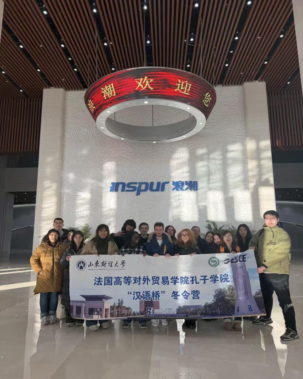 12月25日下午,山东财经大学带领参加法国高等对外贸易学院孔子学院“汉语桥”冬令营的学生们,前往济南市浪潮集团总部进行参观交流。此次活动旨在通过实地探访中国科技领军企业,增进法国青年对中国数字经济发展与企业文化的理解,进一步搭建中法青年交流的桥梁。