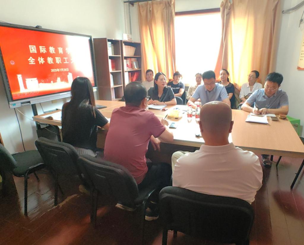 7月28日,国际教育学院在舜耕校区干训楼会议室召开全体教职工大会,推进学院第三轮教师岗位聘用考核工作,部署学院机构设置与人员调整相关任务分工和暑期工作,全体教职工参加。会议由党委书记张红燕主持。